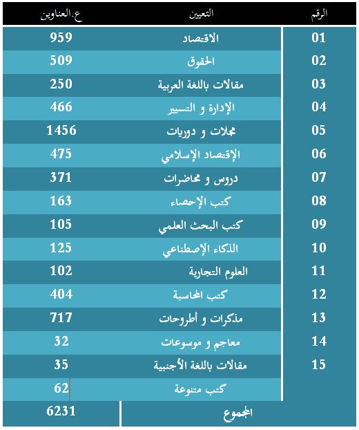 تشتمل المكتبة الرقمية على 6231 عنوان في عدة تخصصات مصنفة كمايلي:
